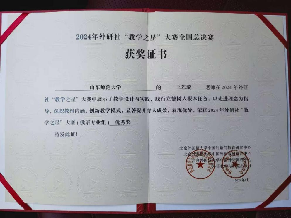 2024年8月15-16日,2024年外研社“教学之星”大赛俄语组全国总决赛成功举办。我院俄语系教师王丽娜,王艺璇代表我校参赛。经过激烈的角逐,两位老师脱颖而出,王丽娜老师获得全国总决赛三等奖,王艺璇老师获得全国总决赛优秀奖,向全国同仁展示了我校俄语教师优秀的教学能力。