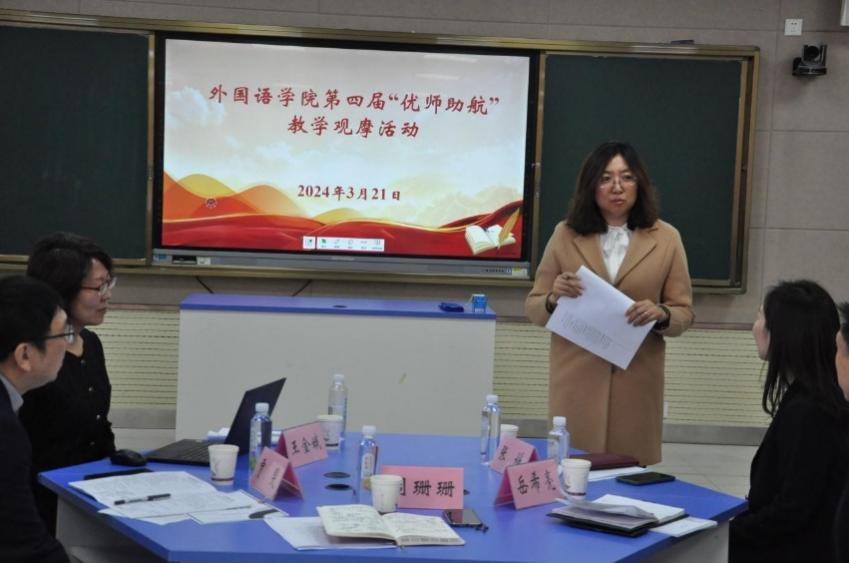 2024年3月21日和4月1日,学院分别举办了两场“优师助航”教研活动。担任主讲的名师是来自大外部的高燕副教授和日语系的王晶老师,她们在外研社举办的全国性教学大赛、山东省青年教学比赛中多次获奖。两位教师通过这次“优师助航”活动中,展现了高度的专业素养和丰富的教学经验,在教学理念、课程设计、课堂活动安排、师生互动、课程思政等多方面提供了优秀的教学示范。活动受到学校有关领导的高度重视,副校长周珊珊、教师教学发展中心主任贾斐、副主任丁同楼分别参加了两次教学观摩和研讨。