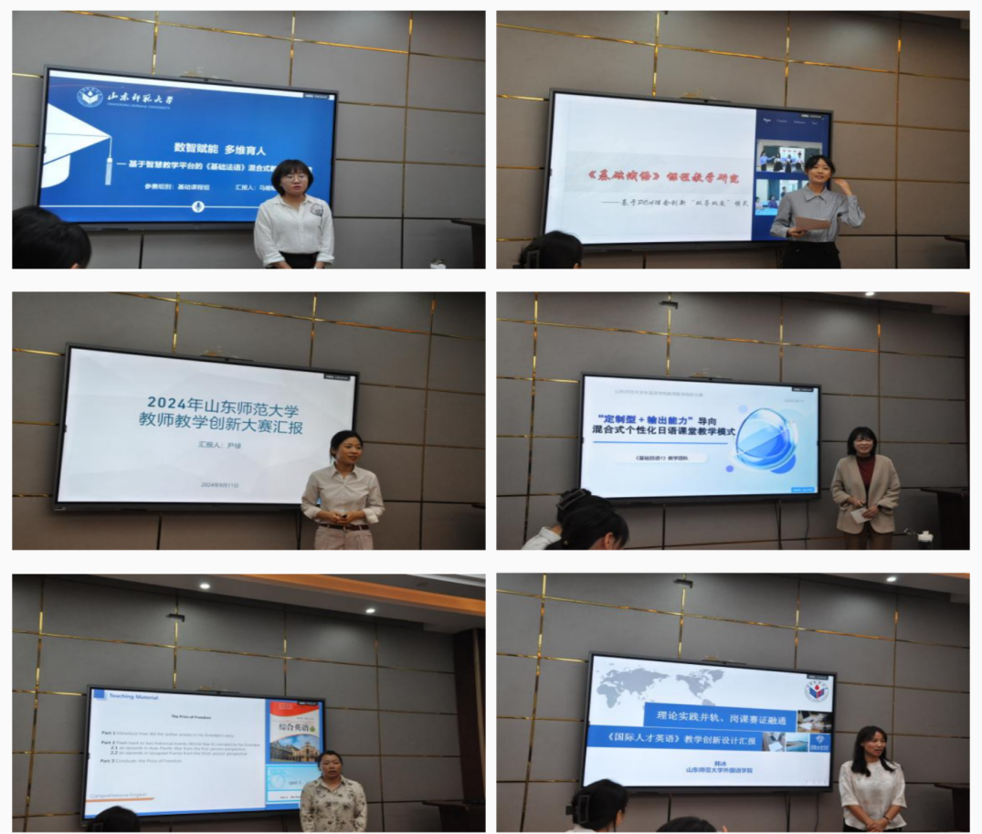 本次教学创新大赛共有六位教师参与角逐:大外部韩冰老师、英语系赵金曼老师、法语系马姗姗老师、俄语系王艺璇老师和尹禄老师、日语系田嫄老师。她们在汇报中深入分析了各自课程的背景、教学难点、创新思维、理念及推广效果等方面。参赛教师聚焦课程内容重构、教学方法更新、教学环境创设及教学评价改革等维度,运用POA产出导向法、BOPPPS教学模式、课程叙事及数字技术赋能等手段进行了深度的创新尝试。