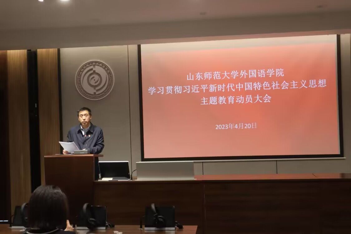 4月20日下午,外国语学院于长清湖校区文渊楼B区242召开学习贯彻习近平新时代中国特色社会主义思想主题教育动员大会。学院党委书记岳希亮,党委委员、副院长陶业涛,党委委员、副院长王金娥,党委委员、党政办主任李源革及全体师生党员参加会议。学院党委副书记张京国主持会议。
