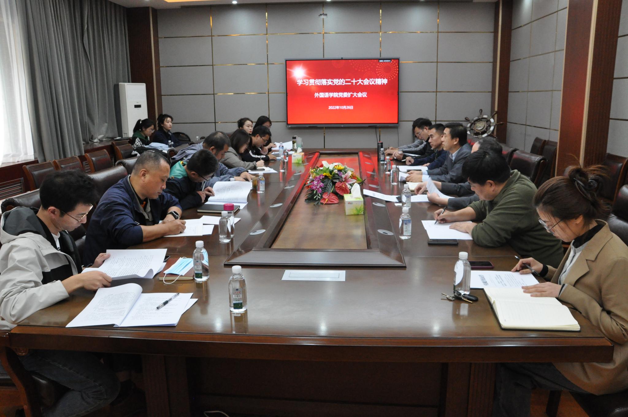10月26日下午,在长清湖校区文渊楼A313会议室外国语学院党委召开扩大会议,专题组织传达学习党的二十大精神、省委和校党委有关会议精神,贯彻落实省委和校党委工作要求。学院党委委员、党支部书记、科级干部、辅导员、行政党支部党员参加了会议。岳希亮书记主持了会议。