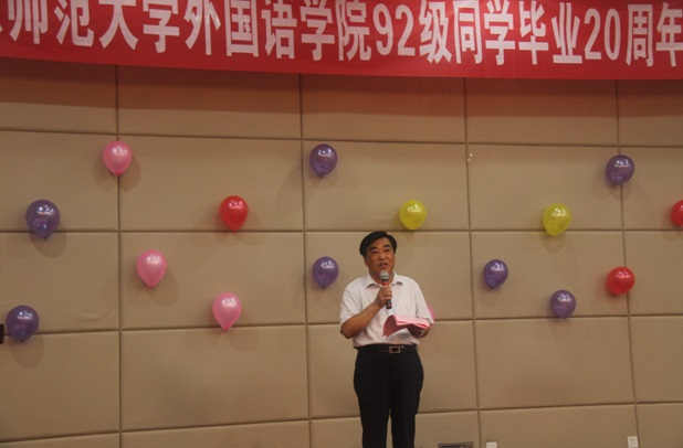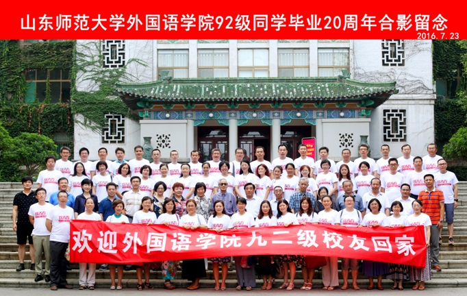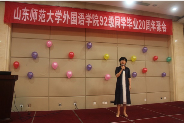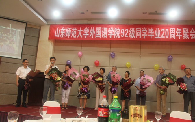 7月23日,外国语学院92级校友重返济南,汇聚母校,隆重举办了毕业二十周年欢庆会。校党委常委、副校长王焕斌同志, 外国语学院副院长王卓、党委副书记金鹏,省高校德育研究室主任姚昌(92级辅导员),山师附中党委书记、副校长谭英海,国际交流学院党总支书记郝秀丽,校友工作办公室副主任陈文亮,校友老教师代表纪昌祥教授、黄德新教授、韩玉华教授、曲明文教授、王庆新教授,在职教师杨敏教授、刘倩教授、刘在良副教授,院党委组织干事李源革,英语系主任徐彬,以及近百位校友和家属参加了欢庆聚会。