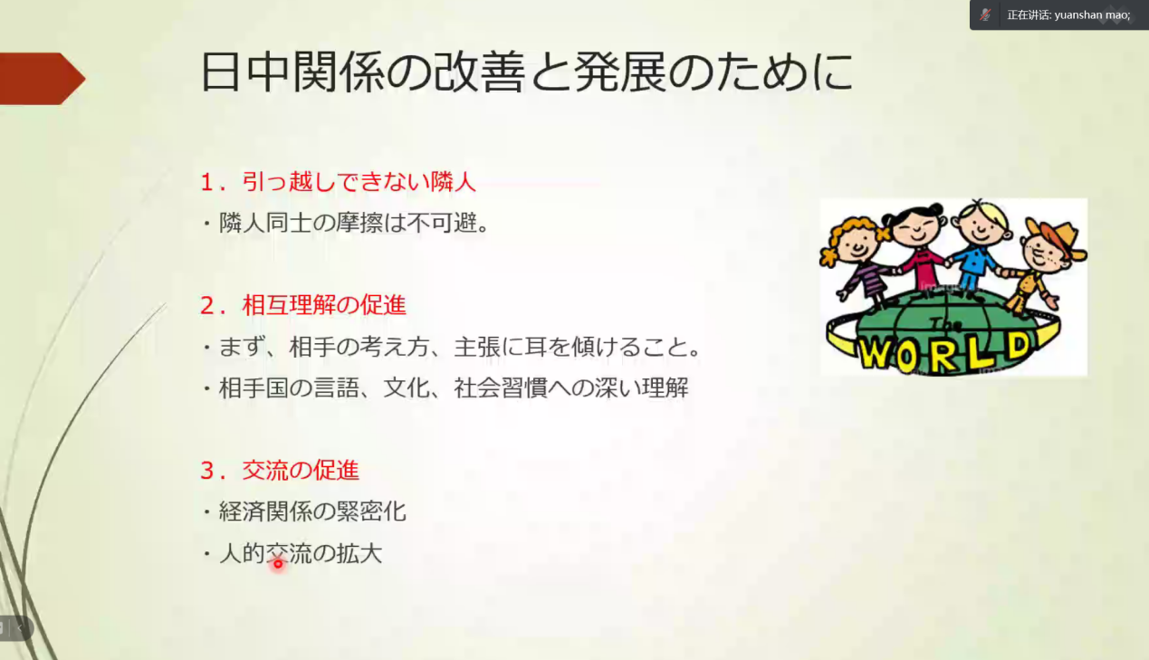 最后,远山先生对中日关系的改善提出了期望。远山先生提到,邻国就像是不能搬家的邻居一样,长久的相处。在这其中摩擦是不可避免的,但是我们要积极的解决这些矛盾。同时也希望促进中日两国双方互相了解,要了解对方的思考方式、语言、文化、社会习惯等。并提出希望加深经济与人文方面的交流。