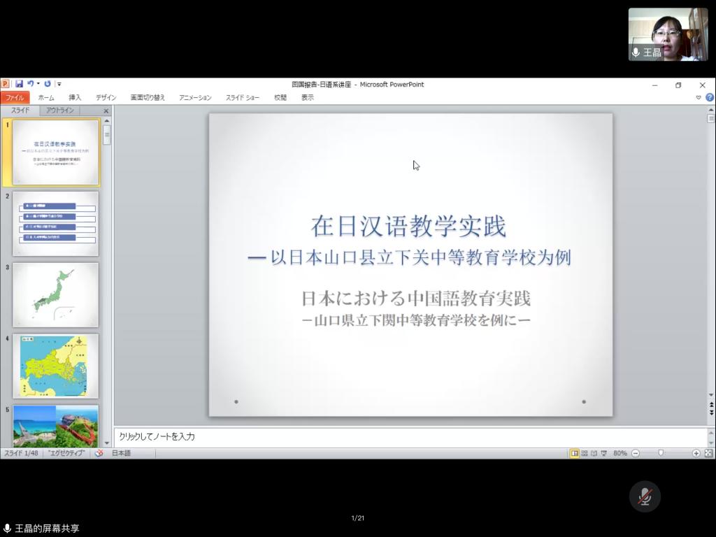 9月26日上午,济南中日交流之窗依托腾讯会议,线上举办了“在日汉语教学实践”主题介绍活动,山东师范大学外国语学院日语系讲师王晶老师担任主讲人,跟大家分享了在山口县下关中等教育学校教授汉语的体会和经验。外国语学院日语系副主任、副教授崔颖博士,日语系外教石田曜博士,以及来自山东师范大学的70余名学生共同参与了此次活动。