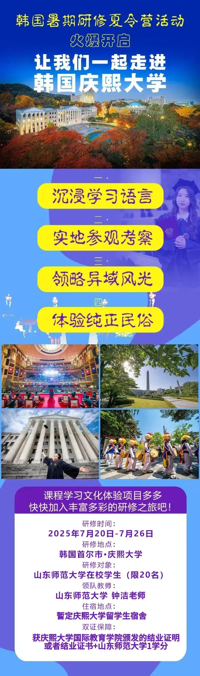 2025年度在本次活动中,在这趟旅程中,你将会感受到不一样的韩国,更好地了解韩国的教育体系、文化和生活方式,体验传统与现代交融的韩国文化,还将有机会对话国际知名学者,深入体验韩国学术氛围与文化魅力,感受传统与现代交融的独特风情,提升国际化时代核心竞争力!