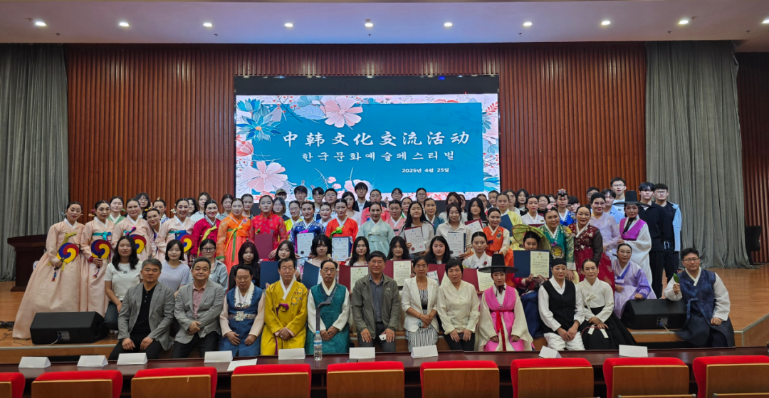 2025年4月25日,为深化中韩文化文明互鉴,促进两国青年友好交流,由山东师范大学外国语学院、韩国学研究所携手韩国国乐艺术团联合主办的“中韩文化交流活动”在山东师范大学长清湖校区文昌楼举行。东语系主任钟洁老师和朝鲜语专业师生代表、韩国学研究所所长金德均教授、高丽大学文化体育学院刘大龙教授等韩国专家学者共80余人参加了本次活动。