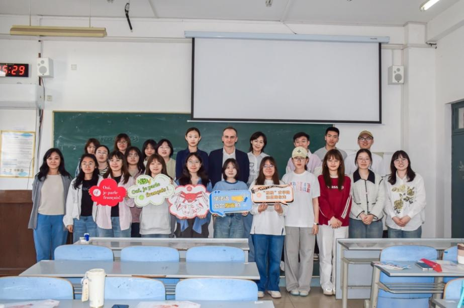 2025年4月10日下午,外国语学院英法复语专业于文渊楼B座234教室成功举办“法国留学&法语互动小课堂”专题活动。活动特邀济南法语联盟校长Laurent Boënnec先生与法国高等教育署济南办事处负责人苑姝婧女士担任主讲嘉宾,由我院夏冰洁老师主持,英法复语专业全体本科生共同参与。