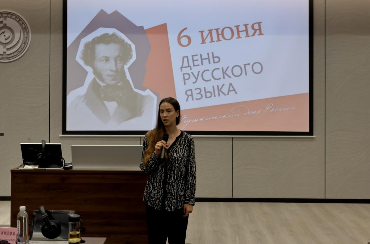 外教А.А. Самсонова对同学们的朗诵给予高度评价,并为大家分享了俄语日的相关背景内容和俄语文化图景。她提到,俄语日源于6月6日普希金诞辰,这位文学巨匠奠定现代俄语文学根基,托尔斯泰、高尔基等名家都对俄语内涵和外延的丰富性给出过精彩阐释。同时,俄语同义词体系庞大,同一词汇因语境、语体差异呈现多样语义,俄语的语音语调变化也是及广大而尽精微,重音与语气转换即可赋予语言不同的涵义。如今,俄语作为联合国、金砖国家组织和亚太经合组织等国际组织的官方语言,在国际事务与跨文化交流中占据重要地位,广泛通行于俄罗斯及前 苏联地区,全球使用人数超2.6亿,而且俄语词汇库随时代发展动态更新,新科技、经济词汇不断涌现,旧词逐渐隐退。除此之外,俄语日期间,全球俄语学习者、文化研究者及爱好者通过诗歌朗诵、学术讲座、语言竞赛等形式,共同致敬俄语文化,推动其传承与发展。