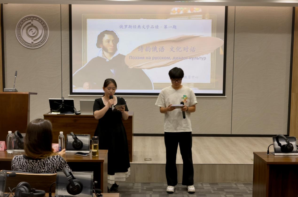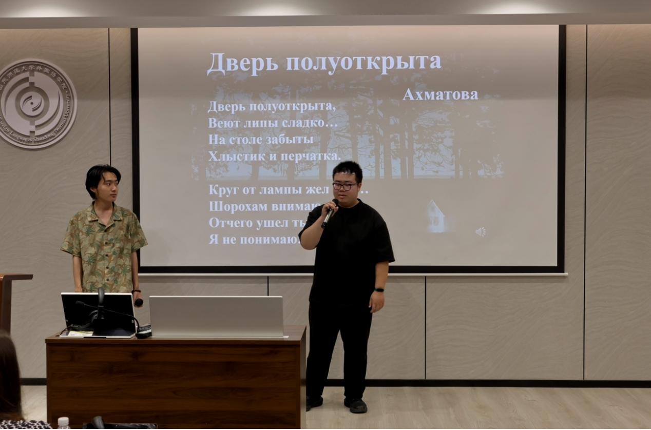 活动中,俄语系大二、大三年级的同学们情感充沛地为大家诵读了俄罗斯经典诗歌作品。从《不要禁锢自己的梦想》的激昂号召,到《冬日的早晨》的静谧描绘,再到普希金笔下《致凯恩》的深情、《致大海》的壮阔,以及《假如生活欺骗了你》的哲思、《致恰达耶夫》的炽热,最后以《门半开着》作结尾,同学们以扎实的语言功底与深厚的文学素养,生动展现了俄语的诗歌魅力。