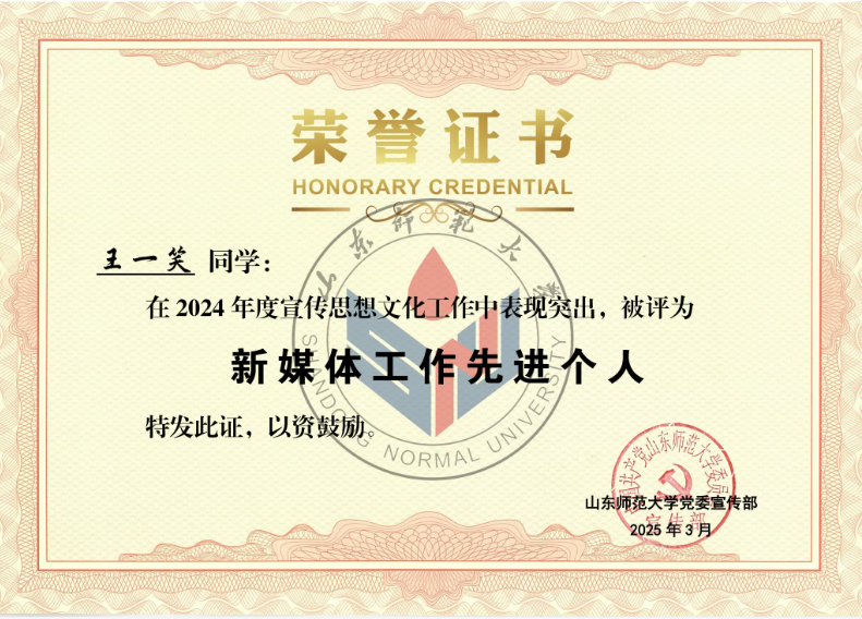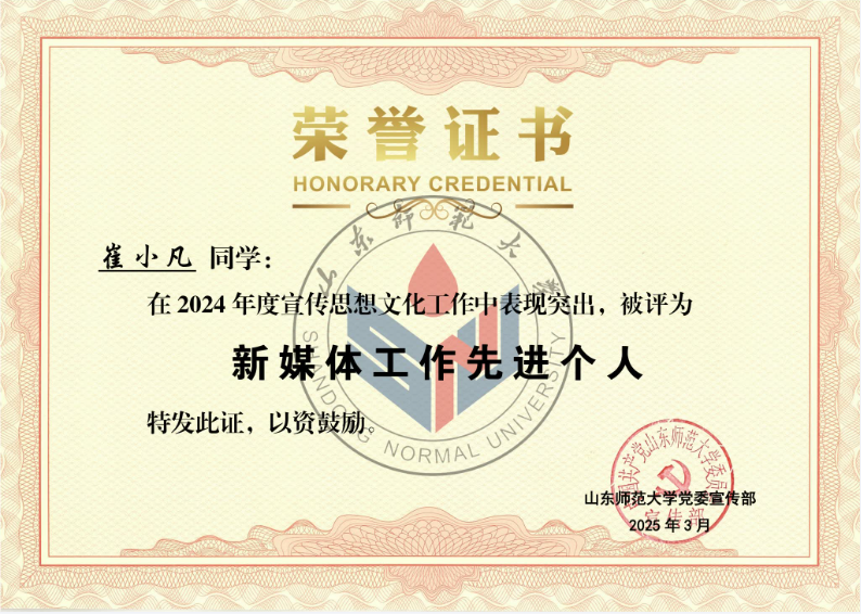 外国语学院在此次评选中获“2024年度优秀新媒体”称号,潘洁、付晓朦两位老师荣获“宣传思想文化工作先进个人”称号,王一笑、崔小凡两位同学荣获“新媒体工作先进个人”称号。