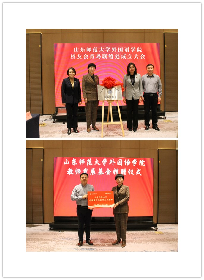 会上,通过了《山东师范大学外国语学院校友会青岛联络处章程》《山东师范大学外国语学院校友会青岛联络处理事会人员名单》。90级俄语专业校友王明光当选为校友会会长。周珊珊副校长、学校合作发展处赵湘轶处长、王明光会长、王卓院长共同为外国语学院校友会青岛联络处揭牌。88级英语专业校友、学院校友会青岛联络处副会长孙德新代表校友捐赠教师发展基金。青岛校友们对外国语学院校友会青岛联络处的成立表示祝贺,纷纷表示会进一步关心助力学校学院的发展。