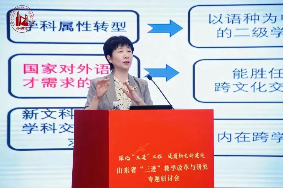 为全面贯彻党的二十大及二十届二中、三中全会精神和全国教育大会精神,落实《教育强国建设规划纲要(2024—2035年)》部署,7月4日,“深化‘三进’工作 提质新文科建设——山东省‘三进’教学改革与研究专题研讨会”在济南召开。来自山东省内50余所高校的近200名教务负责人、外语院系骨干教师及《理解当代中国》系列教材任课教师齐聚一堂,共谋外语教育改革创新路径。外国语学院院长王卓、英语系副主任刘焱参加了此次会议。
