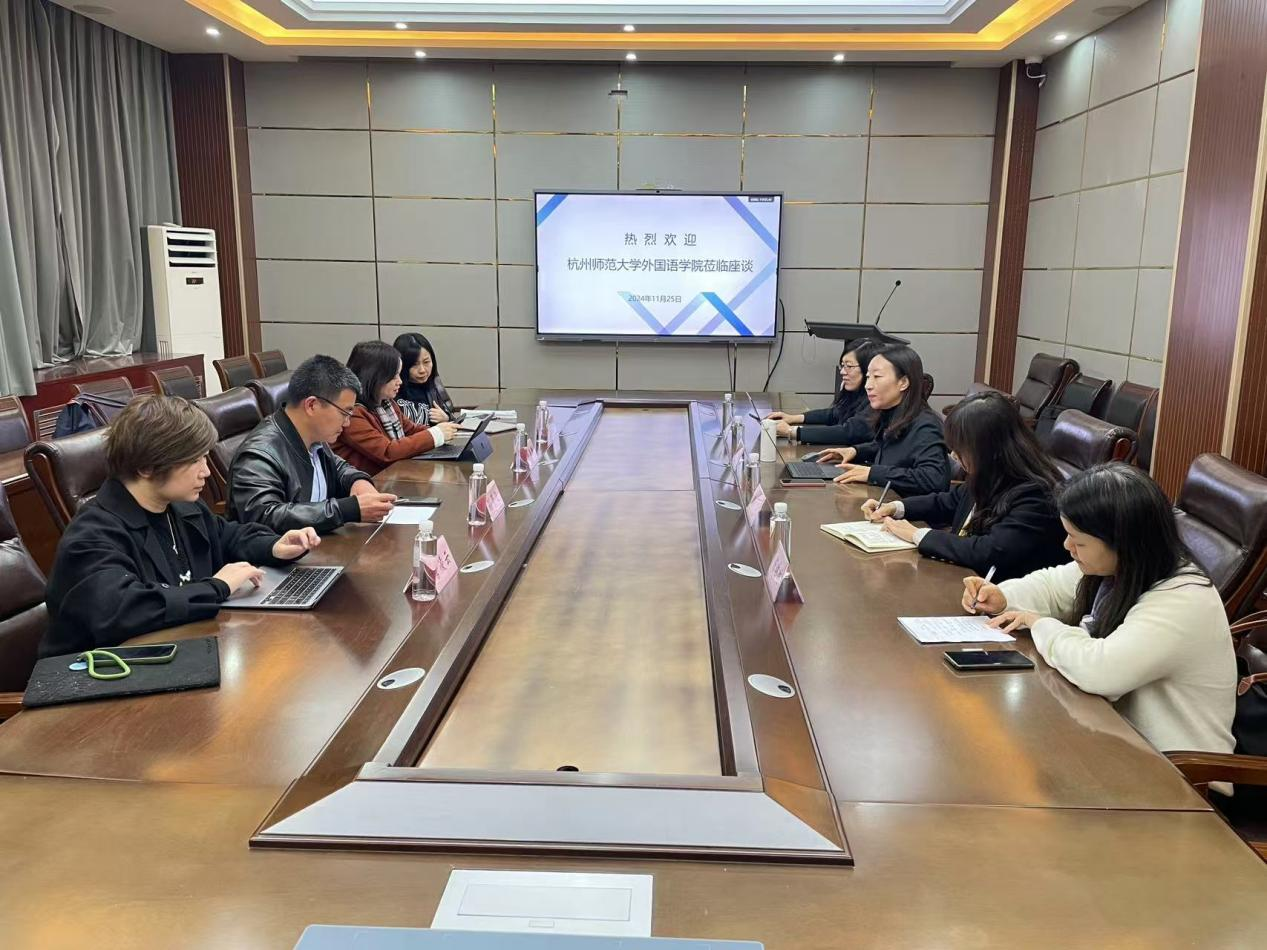 11月25日上午,杭州师范大学外国语学院孙崇飞副院长携同团队一行4人莅临我院进行调研与交流。参加调研会议有杭州师范大学外国语学院副院长孙崇飞,大外部主任卢美艳,大外部副主任管凌云,大外部教研室主任陈忆玮。外国语学院党委书记岳希亮,副院长张媛,大外部主任韩冰,英语系副主任刘炎,大外部教研室主任陈琳琳参加了座谈。