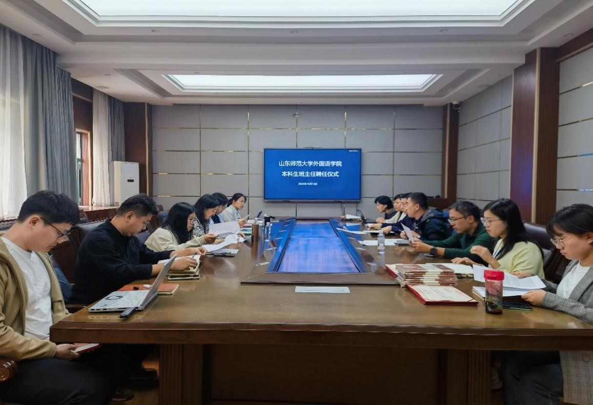 2024年10月16日下午,外国语学院本科生班主任聘任仪式在文渊楼A区313会议室召开。外国语学院党委书记岳希亮、党委副书记陶业涛、新聘班主任、相关辅导员参加会议。党委副书记陶业涛主持聘任仪式。