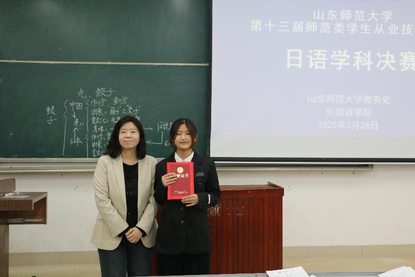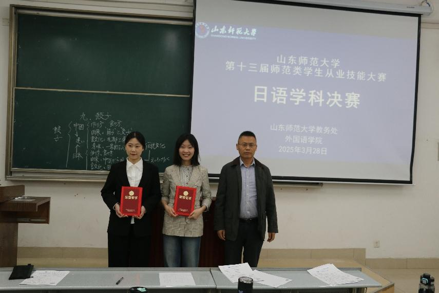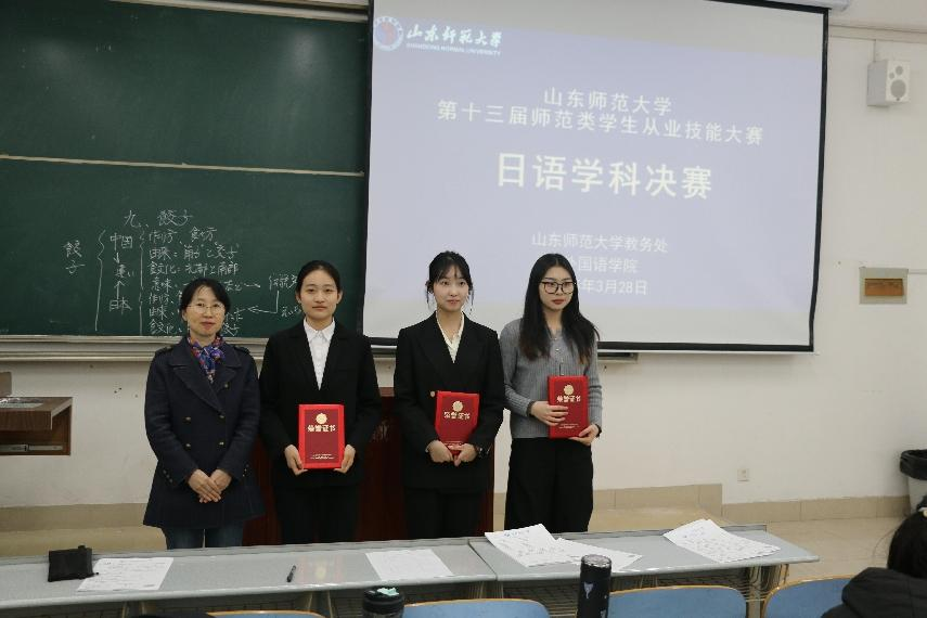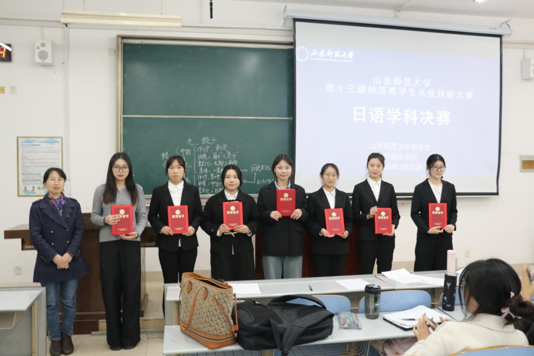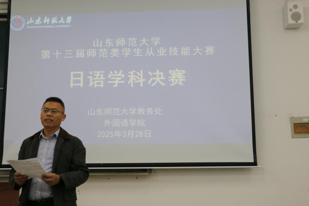 2025年3月28日晚,由我校教务处、外国语学院、济南中日交流之窗联合举办的山东师范大学第十三届师范生从业技能大赛在长清湖校区文渊楼 B 座 226 教室顺利举行。日语系崔颖主任、孙守峰副主任和曲晓燕副教授出席大赛并担任评委,济南中日交流之窗学生负责人杨洋担任主持人,日语系2022级共12名学生参与决赛。