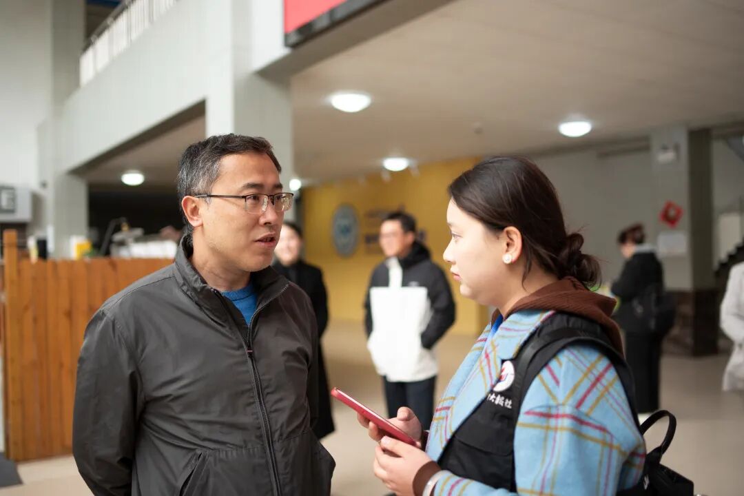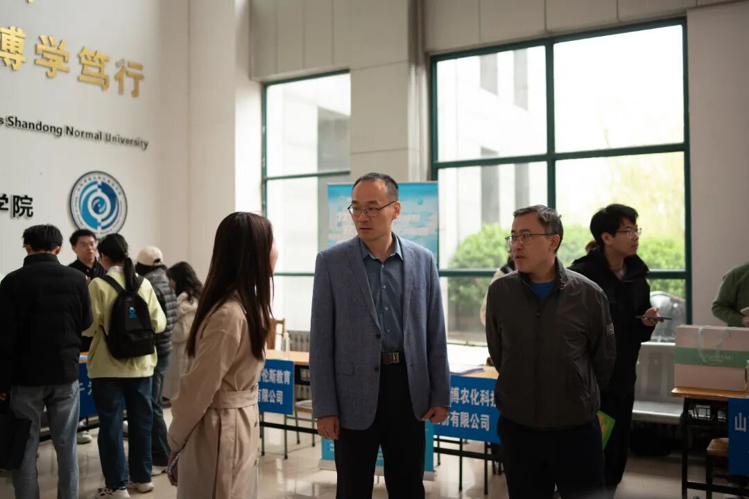 招聘会现场,王松听取了学院招聘会筹备工作的汇报和招聘单位情况,并与毕业生亲切交谈。司世牧与参会单位和求职学生就人才需求、外语类岗位设置等问题展开了交流,并询问了毕业生的职业规划、求职意向及就业进展。