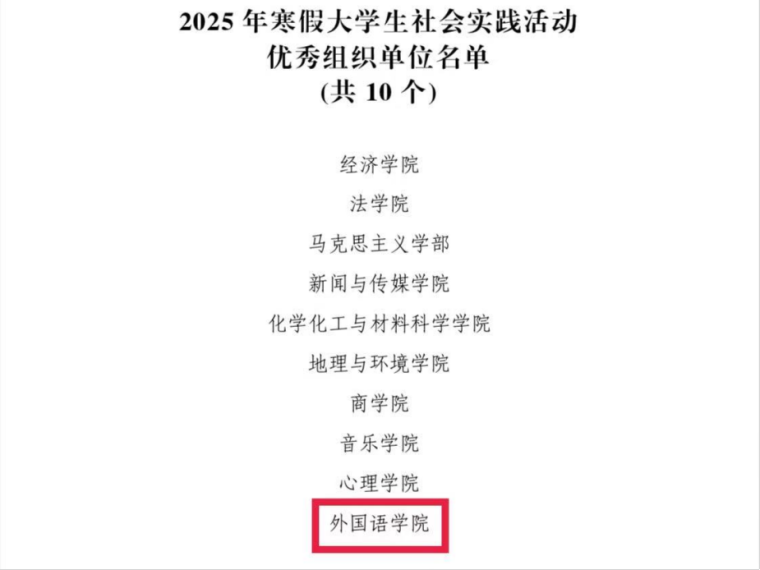 4月18日,校团委发布了《关于表彰2025年寒假大学生社会实践活动优秀组织单位、十佳调研报告、校级优秀调研报告及优秀个人的决定》,在此次表彰中,外国语学院荣获“优秀组织单位”称号。