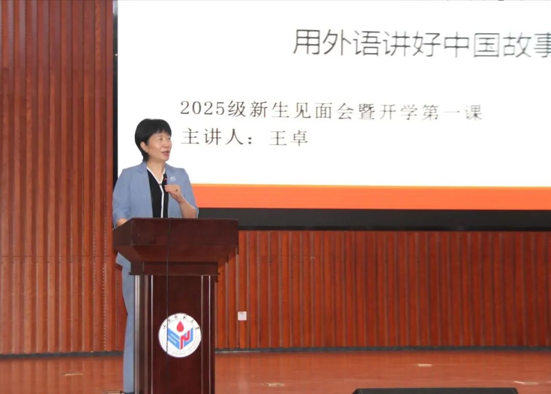 王卓院长给新生们讲授题为“做新时代外语学人,用外语讲好中国故事”的开学第一课。首先,王卓为新生们介绍了山师外院的基本情况。山东师范大学是一所历史悠久的综合性师范大学,山师外院同样也是文脉悠长,平台广阔,专业实力雄厚。同时,她指出外语专业语言是根基而非全部。在AI时代,外语学习不仅要掌握听说读写译的基本技能,更要凭借背后渊博的知识体系,更好的服务于国家对外发展战略。最后,王卓鼓励全体新生要保持热情与活力。学院期待同学们与文脉悠长、朝气蓬勃的山师外院一同进步。