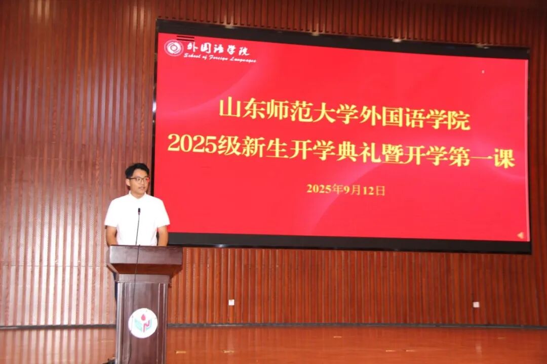 2025级本科新生杜政谋作为新生代表发言。杜政谋坦诚分享了自己的复读经历,他将进入山师外院视作梦想的新起点,明确表示要把誓言转化为行动,扎实学好专业本领,将担当融入青春历程。他承诺,未来会以饱满热情投入学习,在实践中锤炼能力,肩负责任成长,让青春与山师同频共振,与祖国同向同行。