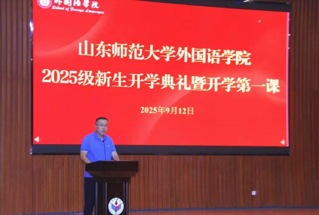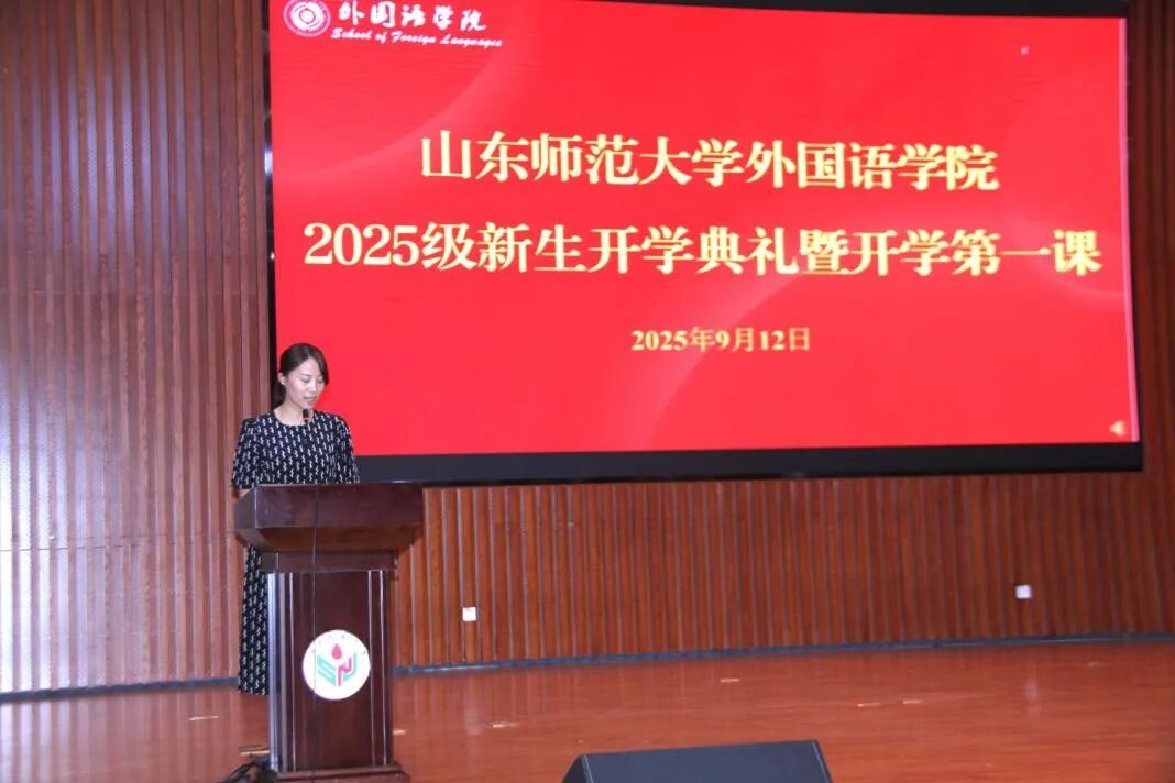 2025年9月12日下午,外国语学院在文昌楼105报告厅举办2025级新生开学典礼暨开学第一课。外国语学院党委书记王松,院长王卓,副院长张媛,副院长翟乃海,党政办主任李源革,团委书记、学工办主任、2025级本科生辅导员唐琨,大学外语教学部主任韩冰,英语系主任王秀香,日语系主任崔颖,俄语系副主任王世臣,朝鲜语专业老师刘涵涵及各年级辅导员出席开学典礼。学院党委副书记司世牧主持开学典礼,2025级全体新生参与活动。