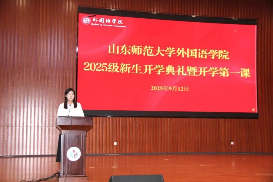 2025级研究生新生代表刘璇发言。她分享了自己与外语结缘的点滴,回顾多年来对外语学习的坚持与热爱,认为外语是探索多元文化的一扇窗,当下时代对语言人才提出了新的更高要求,要不断坚持学术探索、实践创新。最后,她满怀期待之心与大家共勉:以初心为灯,坚守专业热爱;以研究为要,培养独立判断与学术真诚;以实战为界,夯实专业、传递中国声音。号召大家珍惜时光,在山师外院收获成长,谱写青春篇章。