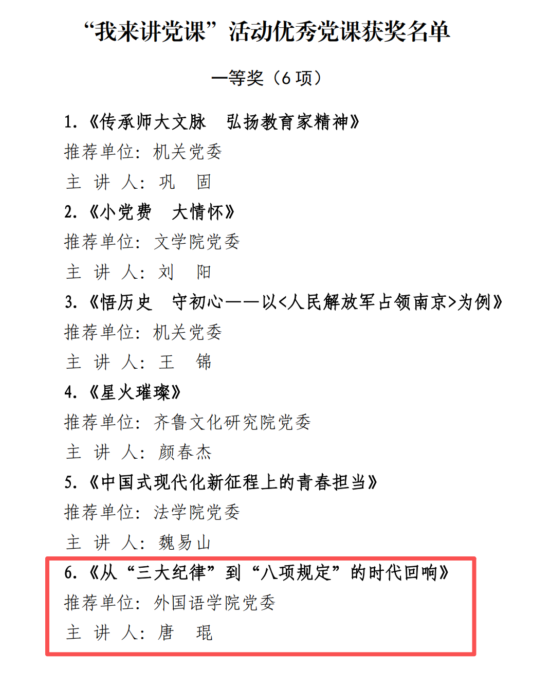为深入学习贯彻习近平新时代中国特色社会主义思想,贯彻落实《全国党员教育培训工作规划(2024-2028年)》精神,切实提高学校党员教育培训工作质效,锻造过硬党员队伍,扎实推动深入贯彻中央八项规定精神学习教育走深走实,学校党委面向全校开展了“党课开讲啦”活动。在本次评选中,我院团委书记、学工办主任唐琨的作品《从“三大纪律”到“八项规定”的时代回响》荣获“我来讲党课”活动优秀党课一等奖。