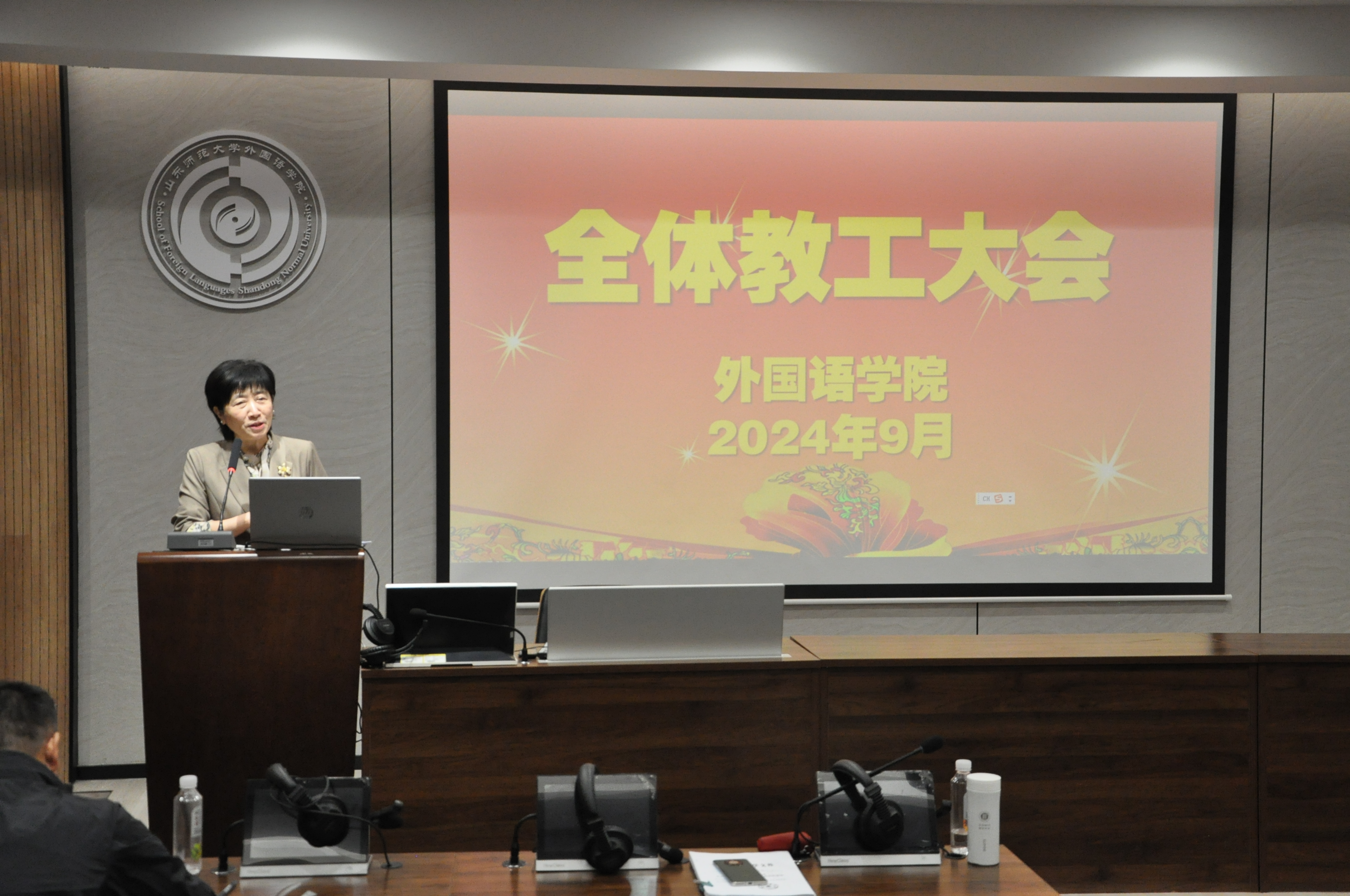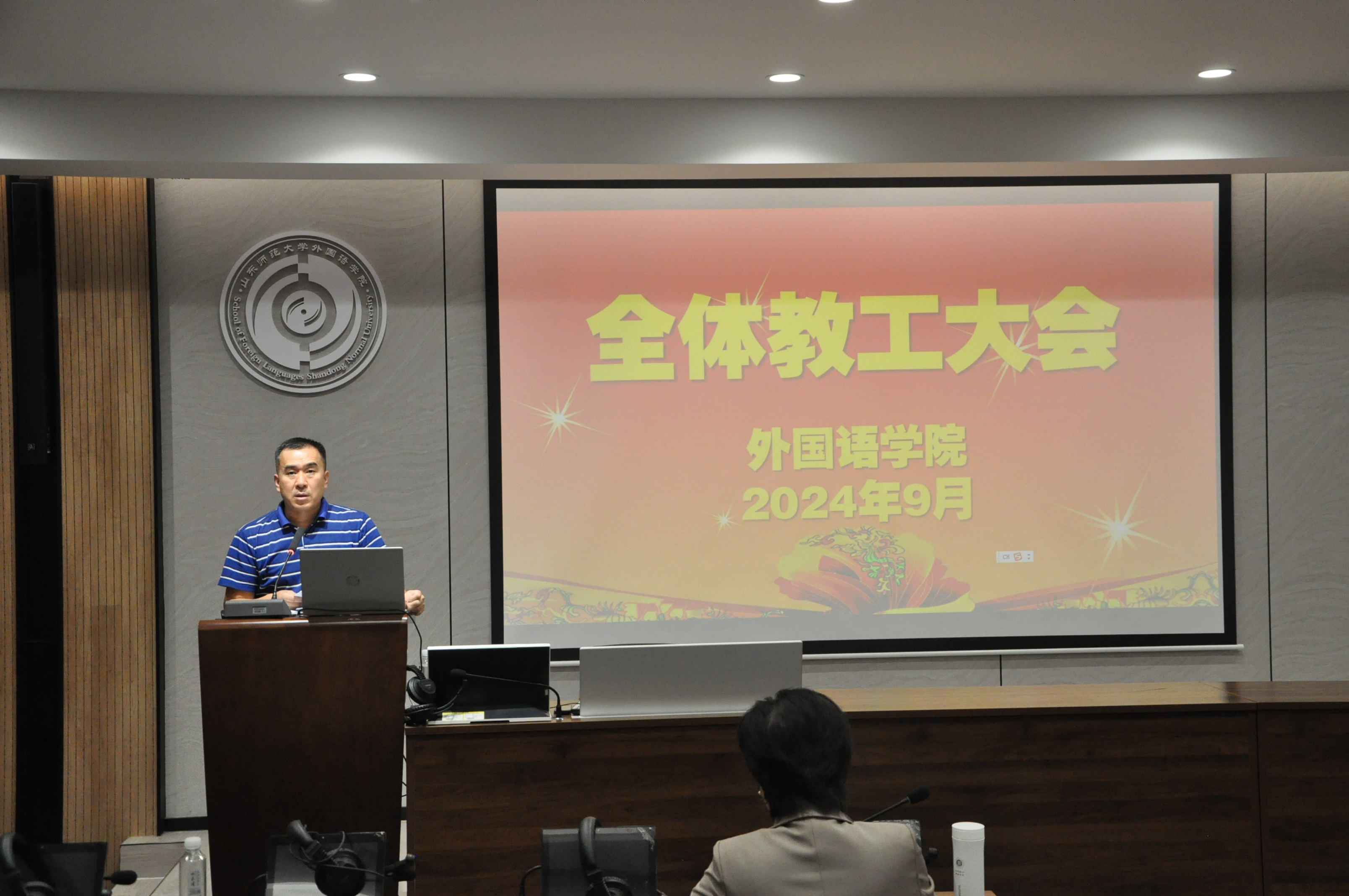 在中华人民共和国成立75周年和第40个教师节到来之际,为大力弘扬教育家精神,激励全体教师和教育工作者落实立德树人根本任务,外国语学院于2024年9月5日下午在长清湖校区文渊楼B区242报告厅举行全体教职工大会暨2024年教师节表彰仪式。会议传达了学校新学期工作动员大会精神,学校第四轮岗位聘用相关要求,并表彰了在学院党建、教学、教研、科研、学生管理、行政管理等工作中贡献突出的6个集体及17个个人。学院领导班子成员,学院全体教职工参加会议。大会及表彰仪式分别由学院党委副书记陶业涛、学院工会主席侯青龙主持。