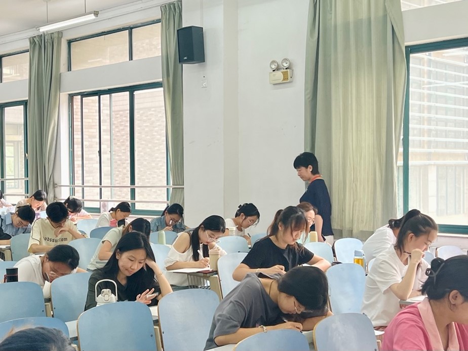 上午,包括《英语语言学》、《基础韩国语》、《西班牙国家概况》、《综合西班牙语》等在内的外国语学院专业考试,共覆盖文渊楼B区6个考场,《大学英语》考试共覆盖文渊楼、文济楼等55个考场。各考场组织有序,纪律严明;考生聚精会神、专注应考;监考教师均佩戴监考牌,认真负责,对考场各角落全覆盖监督。
