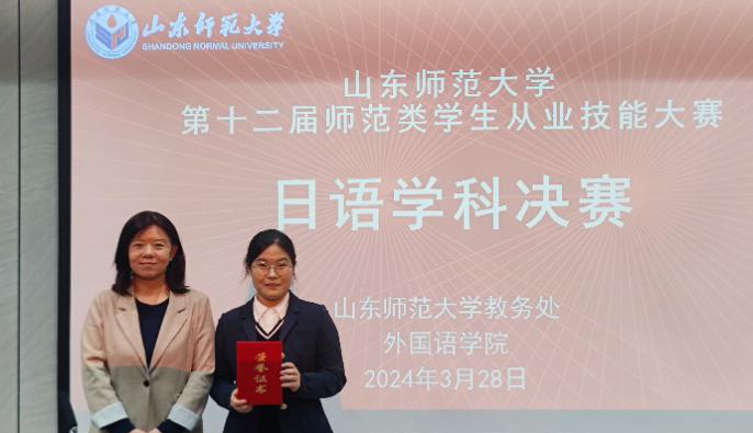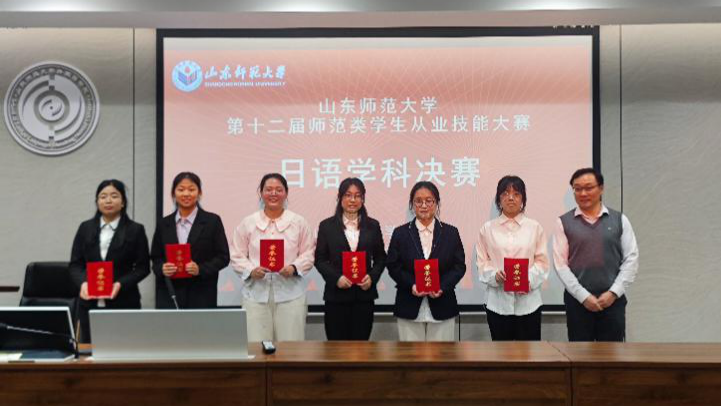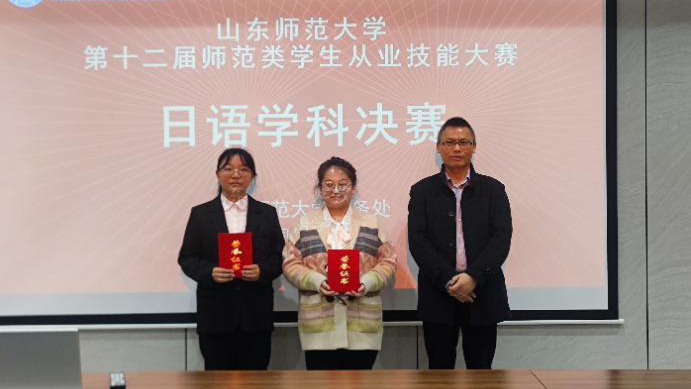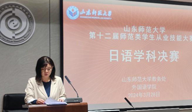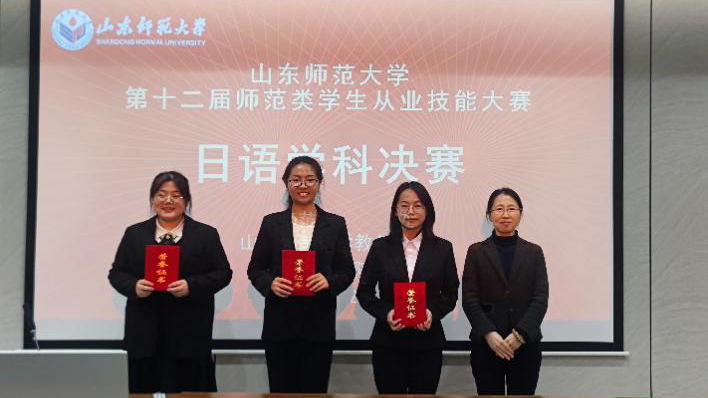 3月28日下午,由我校教务处、外国语学院、济南中日交流之窗联合举办的山东师范大学第十二届师范类学生从业技能大赛日语学科决赛圆满结束。本次大赛于长清湖校区文渊楼B座242教室举行,日语系主任崔颖副教授、日语系副主任张强副教授、孙守峰副教授、教学督导员曲晓燕博士担任评委,济南中日交流之窗学生负责人向舒琴担任主持人,日语系2021级共12名同学进行角逐,本科生近80人于现场观看了此次比赛。