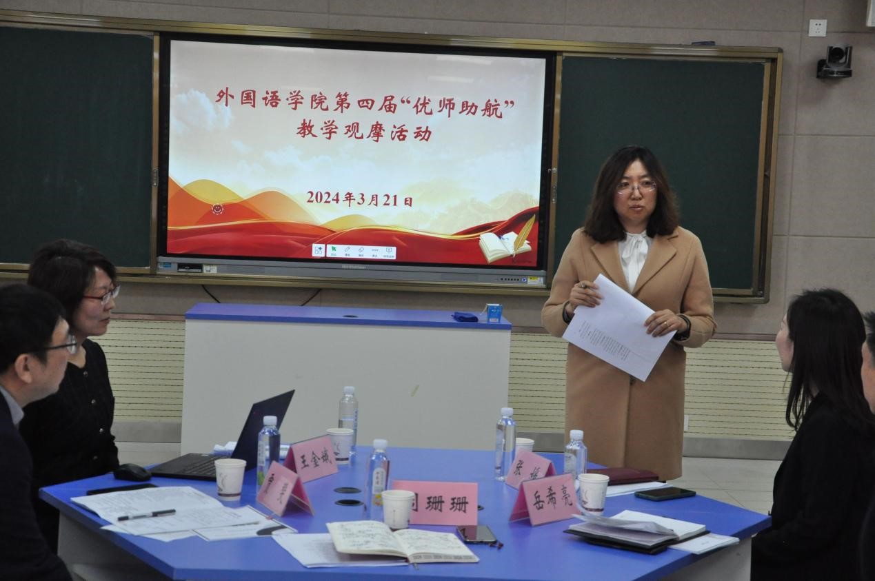 贾斐主任首先肯定了高燕老师的付出,随后他点出在教学理念方面,高燕老师真正贯彻了以学生为中心的理念;在教学内容方面,真正做到了教材与书本内容的结合;在教学设计方面,真正调动了学生的课堂参与积极性;在教学技术方面,熟练运用了科技成果,进行了混合式教学;在教学思想方面,切实的将思政思想融入到了课堂中,充分体现了中国传统文化的文化精神。最后,他表达了对青年教师们的期望,希望他们能够在未来的教育事业中取得辉煌的成就。