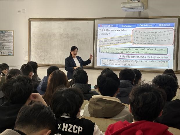 高燕老师所展示的内容为大学英语基础课程第二册第三单元Friendship (友情) 。由于本节课是该单元的第一次课——单元导入,为学生学习本单元的三篇语篇做铺垫,因此高老师在语言内容与形式、学习过程与方法以及思想态度与价值观方面为学生做好了充分的准备。授课内容分为三大部分:Friendship(友情)如何定义;探索中外名言在友情方面表现了怎样的文化差异性;怎样建立和谐、融洽的人际交往关系。高燕老师由浅入深启发学生不断思考,鼓励学生用语言做支撑表达思想,在锻炼语言技能的同时也达到了思政育人的效果。