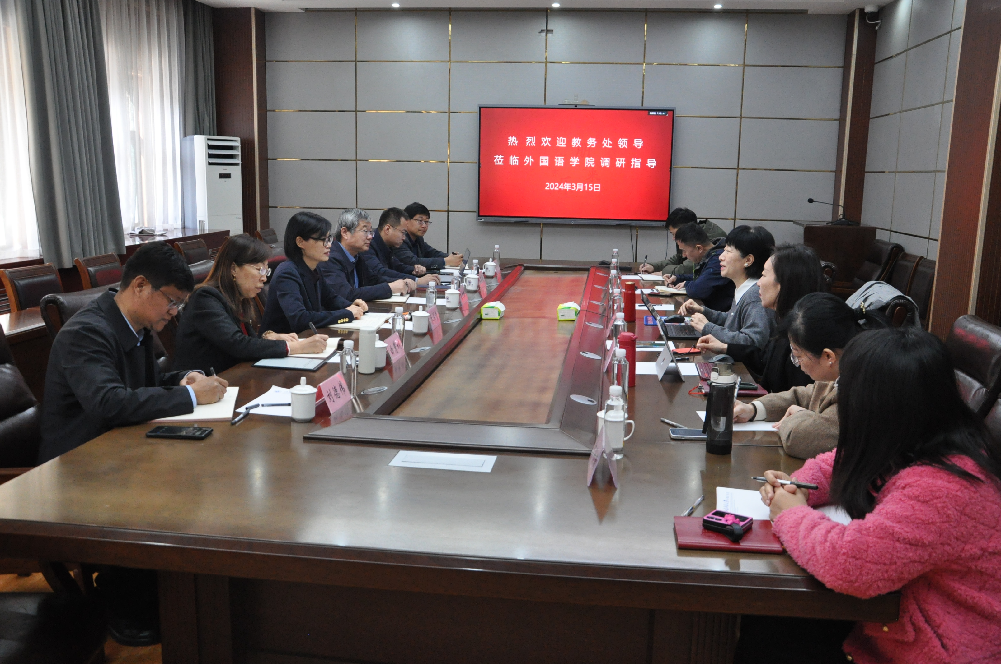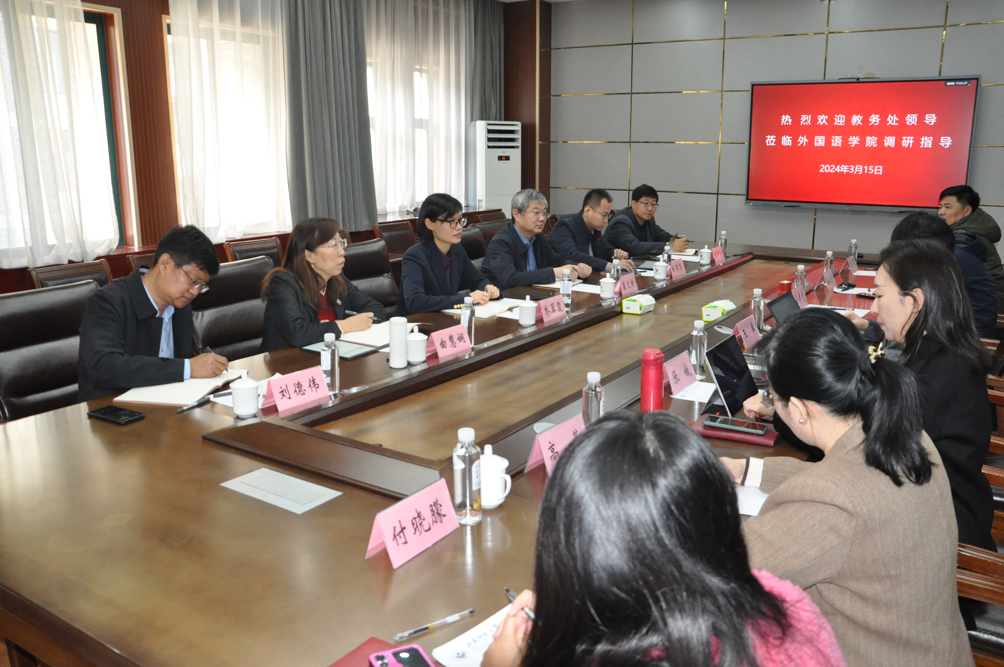 3月15日上午,学校教务处处长乔翠霞,副处长崔文新、曲慧娴、杜德彭,教务处综合办公室主任刘德伟、教学研究科主任王中杰等一行莅临外国语学院调研指导工作。此次调研活动在长清校区文渊楼A313会议室举行。学院院长王卓、副书记陶业涛、副院长张媛、党政办主任李源革、大外部副主任高燕、2020级辅导员付晓朦参加了座谈会。