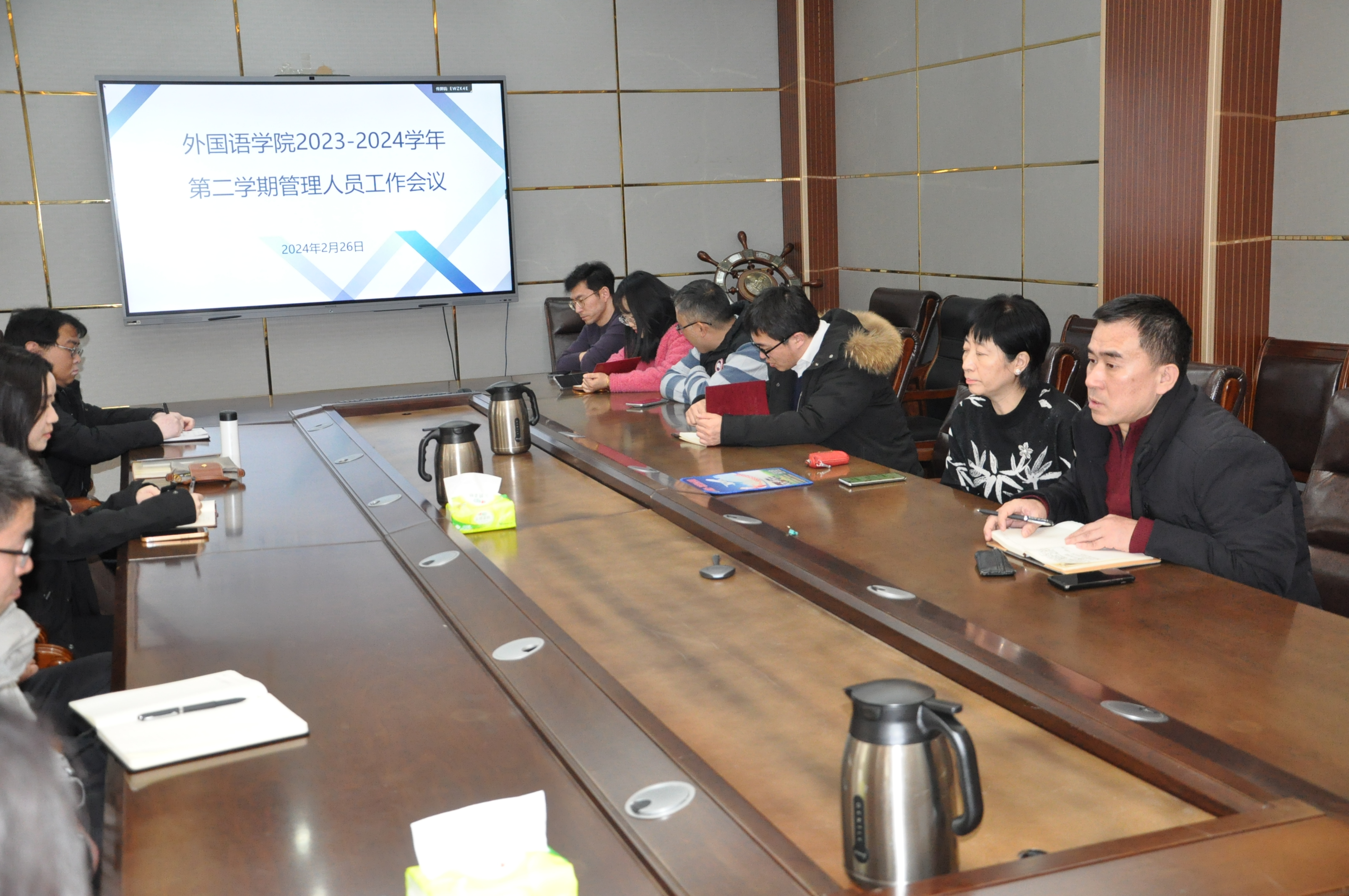 2月26日下午,外国语学院在313会议室召开新学期管理人员会议。学院党委书记岳希亮、院长王卓、党委副书记陶业涛及全体行政人员、辅导员参加会议。会议由陶业涛副书记主持。