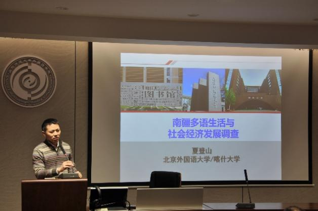 夏登山教授的发言题目是“南疆多语生活与社会经济发展调查”。夏老师及其团队以南疆三地州为范围,对国家通用语言文字、少数民族语言和外语使用情况的现状进行了调查,从个人和社会层面分析了其与中华民族共同体意识等方面的联系,对语言教育和政策的制定提出了建议。