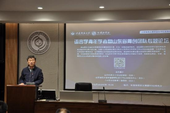 在论坛的主旨报告环节,来自广东外语外贸大学的冉永平教授、山东大学马文教授、北京外国语大学夏登山教授、北京航空航天大学任伟教授、山东大学张延飞教授带来了前沿学术报告。外国语学院的王栋、杨彬、赵卫、孙炬和赵春娟老师分别主持了专家报告。