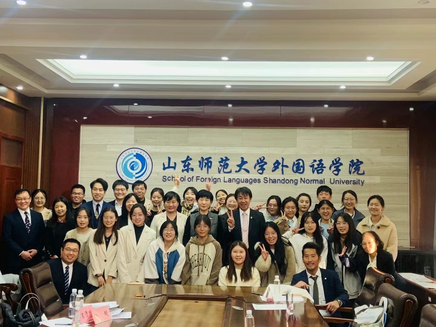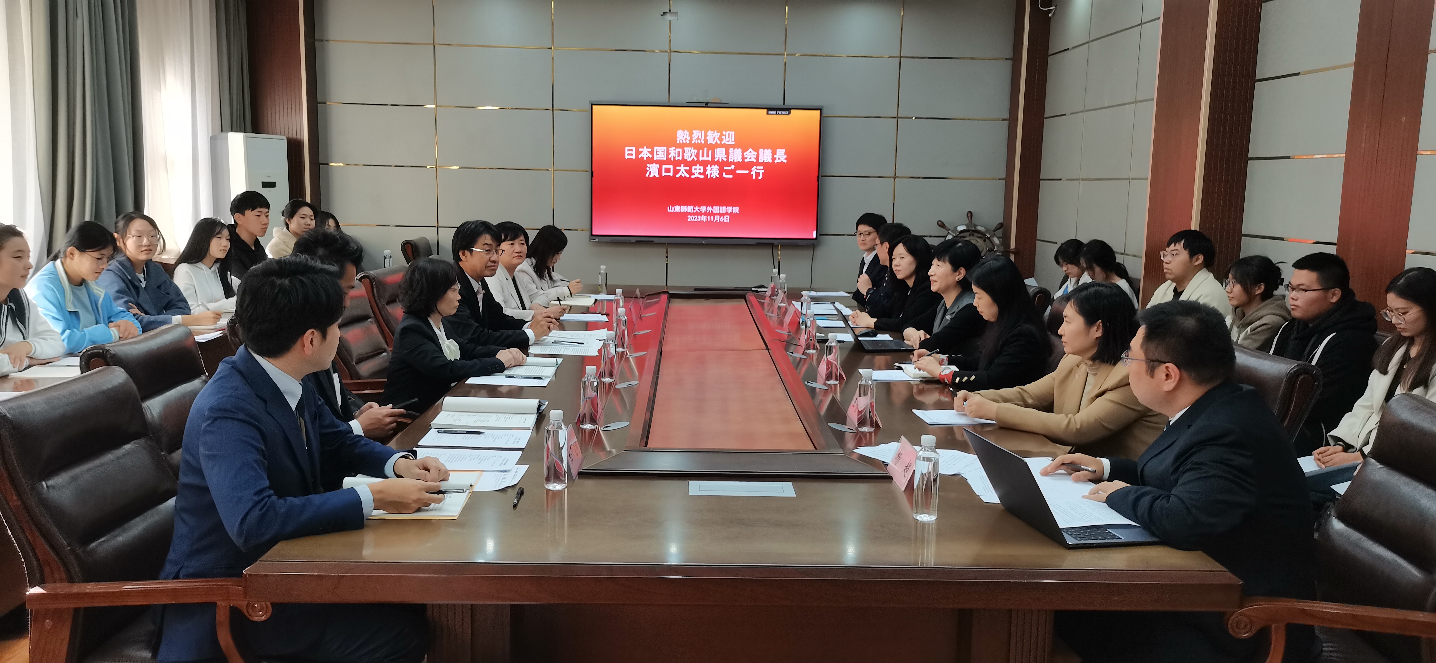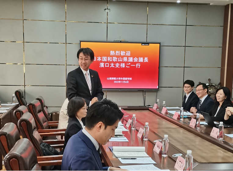 2023年11月6日下午,外国语学院日语系于山东师范大学长清湖校区文渊楼A区313会议室成功举办了“日本和歌山县议会议长滨口太史先生一行与日语系师生座谈会”。日本和歌山县议会议长滨口太史、国际课副课长山田香世、议会事务局秘书广报室课长辅佐北诘刚大、国际科副主查松下直树一行,在山东省委外事办公室亚洲处副处长丛箫、亚洲处四级调研员崔璐的陪同下访问了山东师范大学外国语学院,并与日语系部分师生进行了座谈。山东师范大学国际交流合作处副处长张鸥、国际交流合作处科员王雪瑶、外国语学院院长王卓、日语系主任崔颖、日语系副主任张强、日语系教师杨超、郭睿麒及25名学生代表参加了座谈会。本次会议由崔颖主任主持,由杨超博士担任翻译。