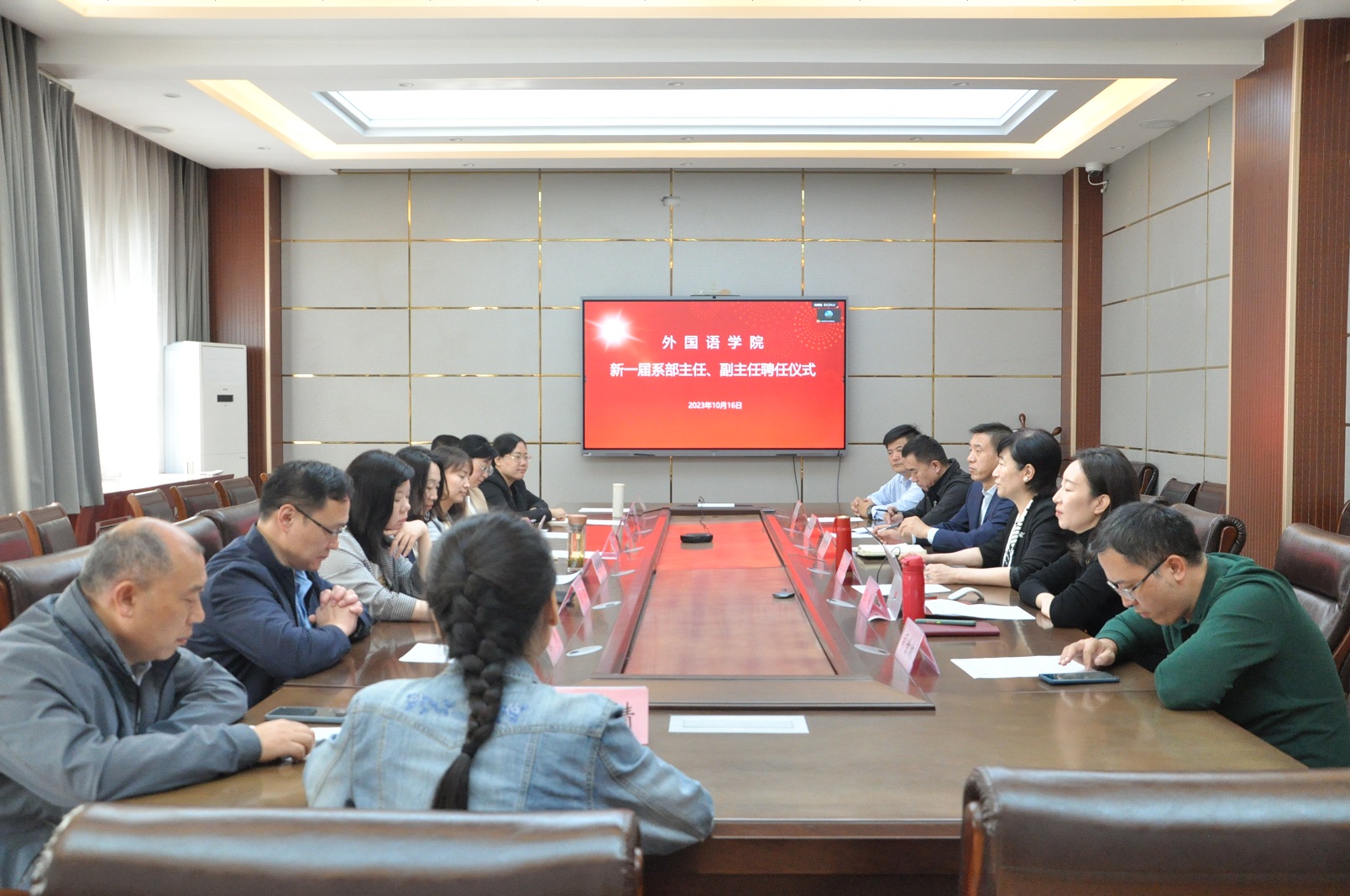 2023年10月16日,在长清湖校区文渊楼A区313会议室,外国语学院举行系部主任、副主任聘任仪式。外国语学院党委书记岳希亮、院长王卓、学院党委副书记陶业涛、副院长张媛、党政办公室主任李源革、学工办主任、团委书记司世牧等出席聘任仪式。学院党委副书记陶业涛主持会议。