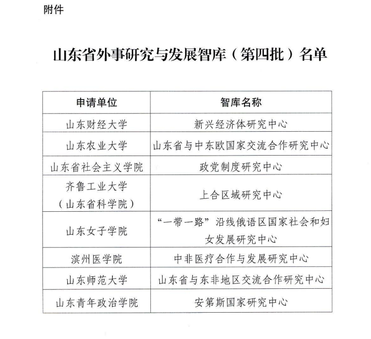 近日,中共山东省委外事工作委员会办公室发布了《关于公布山东省外事研究与发展智库(第四批)名单》的通知。省委外办按照《关于开展外事研究与发展智库建设的实施意见》相关规定,经过严格的评审程序,确定了8家研究机构为山东省外事研究与发展智库(第四批)。由我院王卓院长主持的山东省与东非地区交流合作研究中心成功入选。