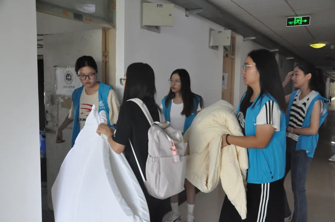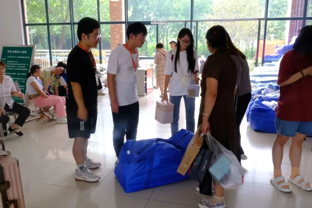 以外国语学院学生会成员为主力的工作人员负责新生扫码报到、档案收取、一卡通及宿舍钥匙分发等工作。在为期两天的报到时间里,工作人员时刻在岗,严谨细致地为每一名新生完成报到流程、解答新生疑虑、完成迎新过程中的统筹安排工作、保障迎新工作顺利进行。
