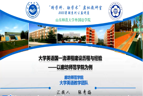 随着2023年4月第二批国家一流课程的公布,新的一轮省一流、国一流课程的申报也即将提上日程。教研室各高校在课程建设方面投入了大量的精力,但针对课程申报、材料整理等方面依然存在诸多困惑。2023年7月25日19点,虚拟教研室邀请两位第二批国家级一流课程的主持人廊坊师范学院张秀梅教授和山东师范大学王卓教授,做客暑期系列公益讲座。张教授介绍了廊坊师范学院《大学英语》课程建设的历史、基本路径、课程内容等,着重向大家展示了团队在课程特色,课程思政等方面的探索。王卓教授通过解读教育部有关一流课设建设的文件,系统的讲解了一流课程建设及评价的体系,并以《美国文学》课程为例,向与会老师展示了如何进行课程的内容重构、方法创新等问题。两位专家细致、全面的解读,为老师们带了一场内容丰富、收获满满的课程建设盛宴。