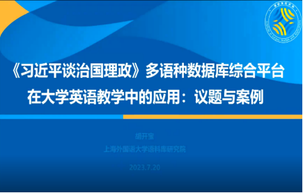 在新文科建设背景下,大学英语学科发展面临更多新形势和新挑战。如何采用科技手段全面推进外语学科高质量发展、实现技术赋能课程思政建设是学界关注的热点,也是高校外语教师普遍关心的问题。2023年7月20日19点,虚拟教研室邀请上海外国语大学校长助理、语料库研究院院长胡开宝教授做客暑期系列公益讲座第一讲,为大家带来了题为“如何在外语教学中更好地运用《习近平谈治国理政》多语种语料库平台”的专题讲座。讲座中,胡开宝教授向老师们展示了《习近平谈治国理政》多语种数据库综合应用平台的检索使用方法,相关术语及其对应的多语翻译资源,与习近平治国理政思想相关的各类资料以及平台为课程思政提供的丰富语言实例,对平台数据化和可视化功能及强大检索功能的教学、科研应用进行了详细讲解。参会教师与胡开宝教授进行了热烈的互动,并纷纷表示收获颇多。