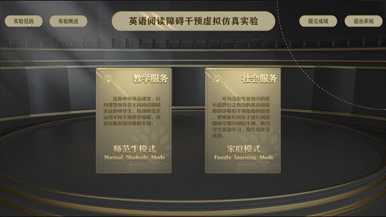 新文科背景下,英语专业教育中的“语言智能+”跨学科能力培养首当其冲,山东师范大学外国语学院师范生培养的核心目标之一就是要求学生运用虚拟现实技术更精准地解决英语语言障碍者的英语学习问题,诊断学习者的语言障碍,并据其障碍类型,对其学习活动和学习内容实施适当干预,提供个性化学习建议和学习计划,加快学生成长速度。然而基于传统教学实验方式,师范生无法完全实现对英语阅读障碍干预机制与流程的直观理解和实操。为帮助师范生更直观、深入地了解英语阅读障碍干预机制原理与执行流程,山东师范大学外国语学院“英语阅读障碍干预研究与教学”团队按照“高阶性、创新性、挑战度”的金课标准,精心设计了“英语阅读障碍干预”虚拟仿真实验项目,现已重磅上线!