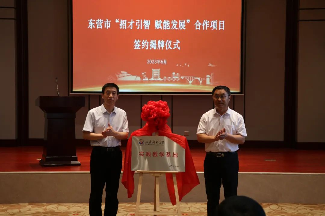 活动中,院长王卓介绍了本次合作项目的具体情况,东营市教育局相关负责同志致辞,山东师范大学外国语学院与东营科技职业学院、东营市实验中学、利津县高级中学、利津县凤凰实验学校进行现场签约,并为山东师范大学实践教学基地揭牌。