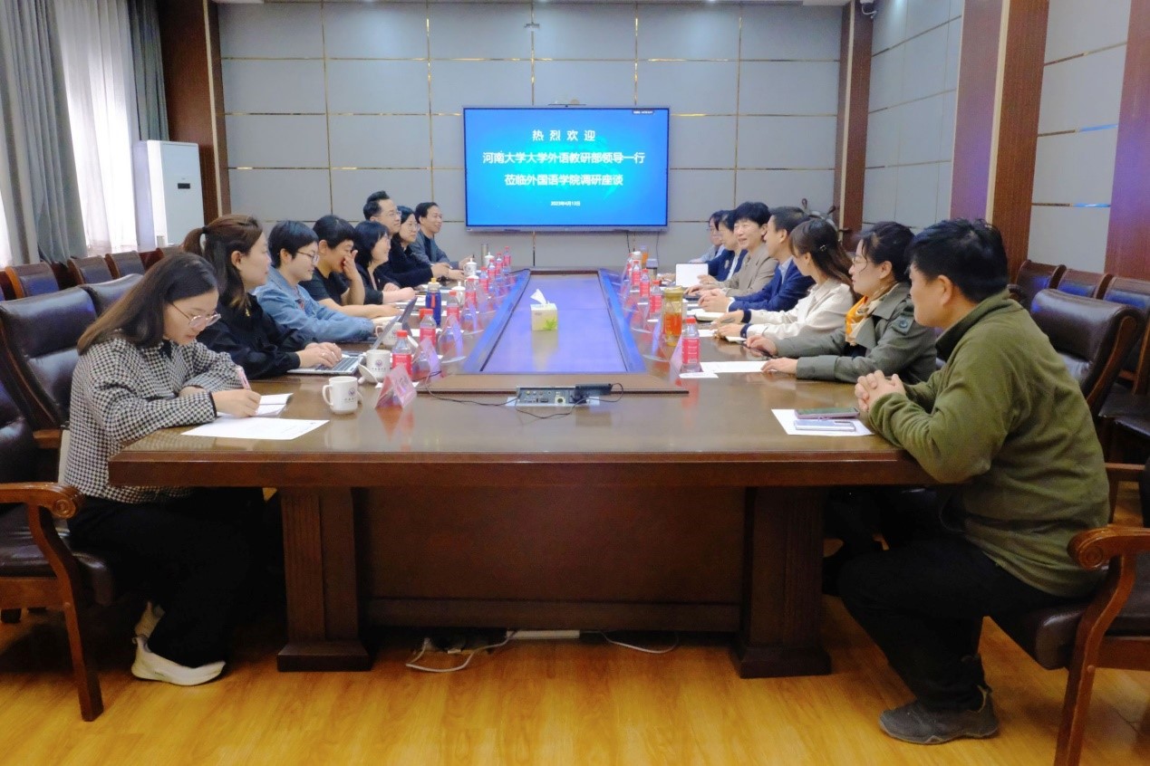 2023年4月13日,山东师范大学外国语学院与河南大学大学外语教研部在文渊楼A区313开展座谈交流。河南大学大学外语教研部副主任谢菲、读写译第一教研室副主任李恩光,读写译第二教研室主任霍颜艳、视听说第一教研室主任郭皓、英语教学与研究中心主任李冬青、继续教育教研室主任安琪、视听说第二教研室主任石慧、副主任薛丽娜等一行莅临山师大外院,开展大学外语教学改革调研、交流。山东师范大学外国语学院党委书记岳希亮,院长、《山东外语教学》主编王卓教授,大学外语教学部副主任高燕、韩冰,教研室主任汤蒙、刘琛参加了座谈。会议由王卓院长主持。