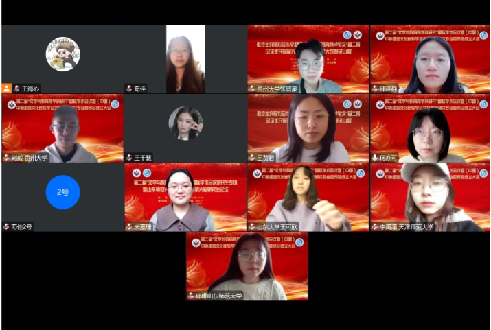 第二组由山东师范大学宋婉宜老师和北京大学刘雨晴同学主持。贵州大学冯叶聚焦工滕隆、兼重努、伊藤悟、娓丸岳四位致力于西南少数民族研究的日本学人,对其研究生涯、踏查方法以及学术轨迹进行分析。北京大学刘雨晴强调当今文学教育应有“重回现场”的自觉意识,因为它向个体的感知与经验敞开,所以拥有无限的可能性,而这一愿景的根源始终是出于人文学者不可磨灭的历史情感与人文关怀。南京大学秦子琦认为老舍青年时期的域外汉语教学经历对于他此后近四十年的创作而言,具有“起源”的意义,身处异城、针对外国人华侨进行汉语教学,的经历为老舍对自己的文学语言进行“加工”、“ 提炼”提供了契机。牡丹江师范学院吴娟以“人民艺术家”老舍的著名文学作品《四世同堂》第三部《饥荒》为研究对象,在接受美学理论框架下,对比分析赵武平和毕冰宾的两个回译本,来探讨译者主体性在翻译过程中的体现。华中科技大学吴可从伦理的视角出发,还原历史现场,结合社会伦理环境,对井上靖小说《杨贵妃传》前中后三个时期的贵妃形象进行深入分析,剖析贵妃最终悔过,未能成为武后,以殉国结束一生的原因,从而揭示作家的写作意图。山东大学吴容畅对《蝴蝶君》展开研究,确认了该剧的同性恋文学属性,认为伽利玛的悲剧成为东方主义和异性恋中心主义双重反噬的必然,同时构成了该剧的双重批判。上海海事大学夏晓柳以霍夫斯泰德的文化维度理论为理论原则,以《傅雷家书》和《怦然心动》为例,从六个文化维度来探索中美家庭教育的相似或差异,从而提出相关的家庭教育建议。长江大学许宁玲通过分析孙悟空的变化与成长经历,浅析教育在人社会化过程中的重要价值,并利用古典文学中的智慧引出对现实中人成长过程的思考,以及对当下的教育具有较深的指导意义。福建师范大学刘玉以凌书华自传体成长小说《古韵》为研究对象,认为教育工作者从这本书中能明显感受到因材施教对学生成长教育的重要影响,它对当下的教育亦具有启发意义。昆明学院董文杰介绍以多视角对云南少数民族童谣进行文本细读与田野实地调查研究的意义,认为其能促进云南少数民族童谣在学前教育中文化内涵的提升,从而为学前本土童谣的课程开发、师资培训和儿童地方文化培养提供可行性思路。兰州理工大学秦嘉蔚从毛泽东诗词言浅意丰、人文贯通、诗史结合三大特点切入,阐释了毛泽东诗词融入高校思政课的价值意蕴,认为其促进了中华传统优秀文化的传承与党史学习教育的深入。山西大学贾祎航探究了魏晋南北朝家训中的“忠”“孝”意识,提出忠孝关系在魏晋南北朝家训中地位逆转,汉代的“忠”重于“孝”逐渐隐匿,“孝” 与之变体“慎”则成为家训教诲的主要内容,这种关注家族与个体精神意志的趋向本质上是士人意志的觉醒的观点。贵州大学林丰琳以《射雕英雄传》为对象,爬梳其在日本的译传与接受的谱系,通过对《射雕英雄传》在日本的译介和传播的研究以及基于日本受众反馈的接受效果研究,揭示了文学的翻译传播效果,提供了有益启迪。贵州大学周智威探究了苗族民间故事《灯花》在日本的绘本创作与读者接受情况,提出对《灯花》展开系统梳理和勾勒,为中国各民族民间故事为素材的绘本创作,讲好中国故事,传播中国声音提供了新的思路与可资借鉴的实现路径。贵州大学付瑜利用亚马逊、“ 絵本ナビ”以及“詩書メーター”等网址收集相关数据和信息,从西藏民间故事日语的出版情况、绘本的作者和绘者、绘本的创作特征以及读者评论等多角度对西藏民间故事日语绘本在日本的创作与接受情况进行了梳理。