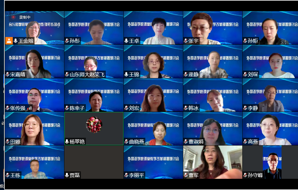 为贯彻学校关于推进落实《深化课堂教学改革行动计划实施方案》有关工作精神及要求,切实推进各专业的课堂教学改革实施工作,优化课堂教学效果,全面提高人才培养质量,外国语学院于9月9日上午10:00以线上会议形式召开了课堂教学改革部署研讨会。王卓院长、王金娥副院长、各系部主任、专业负责人、教研室主任、本学期试点课程授课团队及其他骨干教师、教务员参加会议,会议由王金娥副院长主持。