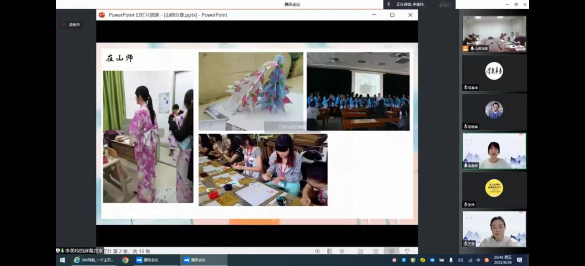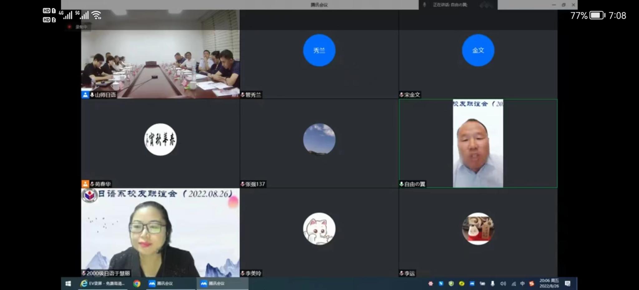 为庆祝我校外国语学院日语专业成立50周年及中日邦交正常化50周年,2022年8月26日,外国语学院日语系采用线下线上结合的方式,举办了“重温初心、共话未来——山东师范大学日语系校友会联谊会”主题活动。我校原纪委书记、现山东圣翰财贸职业学院党委书记、日语系校友会顾问姚东方、外国语学院党委书记岳希亮、对外合作发展办公室(校友工作办公室)副主任陈文亮、科长石晓雪、外国语学院副院长陶业涛以及日语系教师及部分研究生出席会议。
