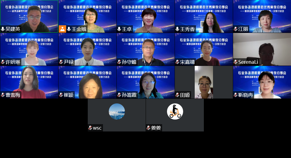 为贯彻教育部《高等学校课程思政建设指导纲要》、山东省教育厅《关于深入推进高等学校课程思政建设的实施意见》以及学校多次发布的有关深入推进课程思政建设文件和通知精神,全面推进专业外语课程思政建设,发挥好每门课程的思政育人作用,外国语学院于6月24日晚采用腾讯会议形式举办了“专业外语课程思政优秀案例分享会暨多语种课程思政工作室第一次研讨活动”。王卓院长、王金娥副院长,以及6个专业的系主任、部分骨干教师及新入职教师参加了此次活动。会议由王金娥副院长主持。