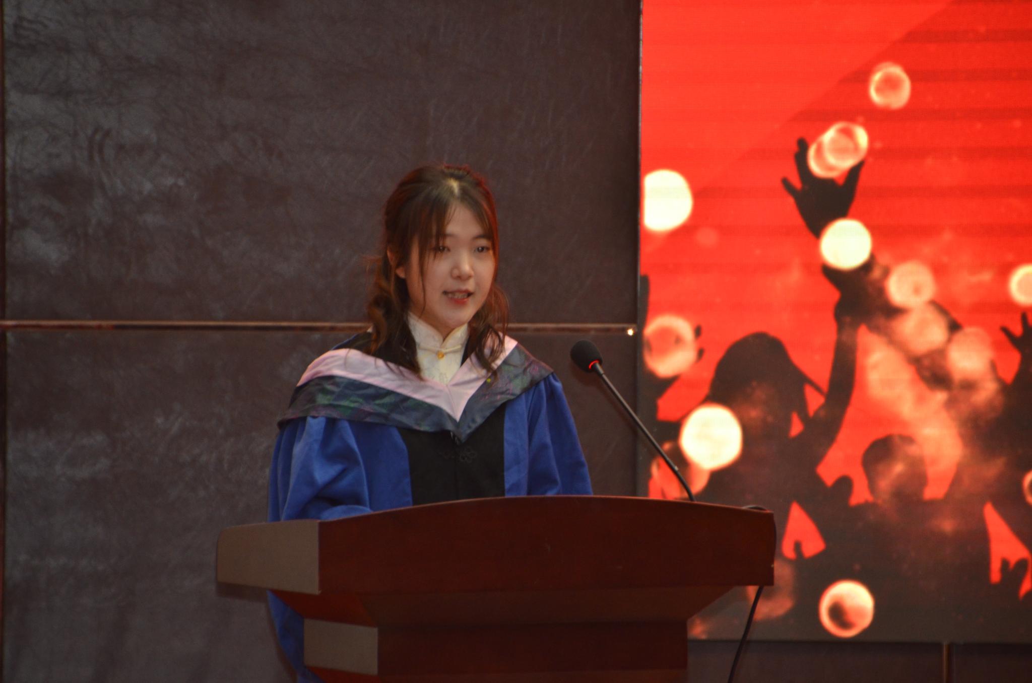 来自2018级英语专业的任牧琪代表2022届全体本科毕业生发言。她对塑就了自己四年美好时光的所有人表达了感谢:领导与老师们的栽培与教导,家长们的养育和支持,同学们的帮助和陪伴;她回顾了外语文化节,寒暑期社会实践,志愿服务活动等生活的片段,外院丰富的活动成就了更完美的自己;她鼓励大家树立远大的理想,无论继续学习深造亦或走向工作岗位,都要敢于争先,砥砺奋进,既为感念,亦是奉献。