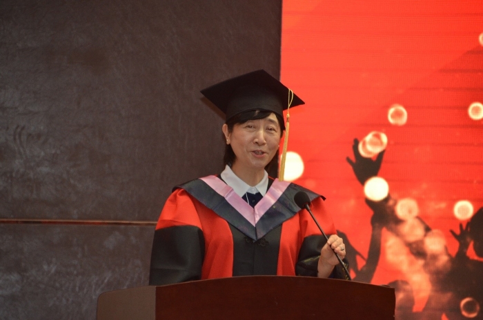 院长王卓向2022届全体毕业生致辞。她指出,在过去的几年中,外国语学院取得了令人喜悦的优异成绩,这与在座师生的努力和贡献密不可分,更为外院的毕业生们提供了更加坚强的后盾;回顾在校的学习与生活,师生一同经历了疫情的变故,也见证了自我的成长,她希望同学们能够继续勇敢地面对不同生活带来的挑战,面对未知的前方做最勇敢的自己;身处这个蓬勃发展的时代,同学们应当心怀感恩,不负韶光,担当起这一代人的时代责任。